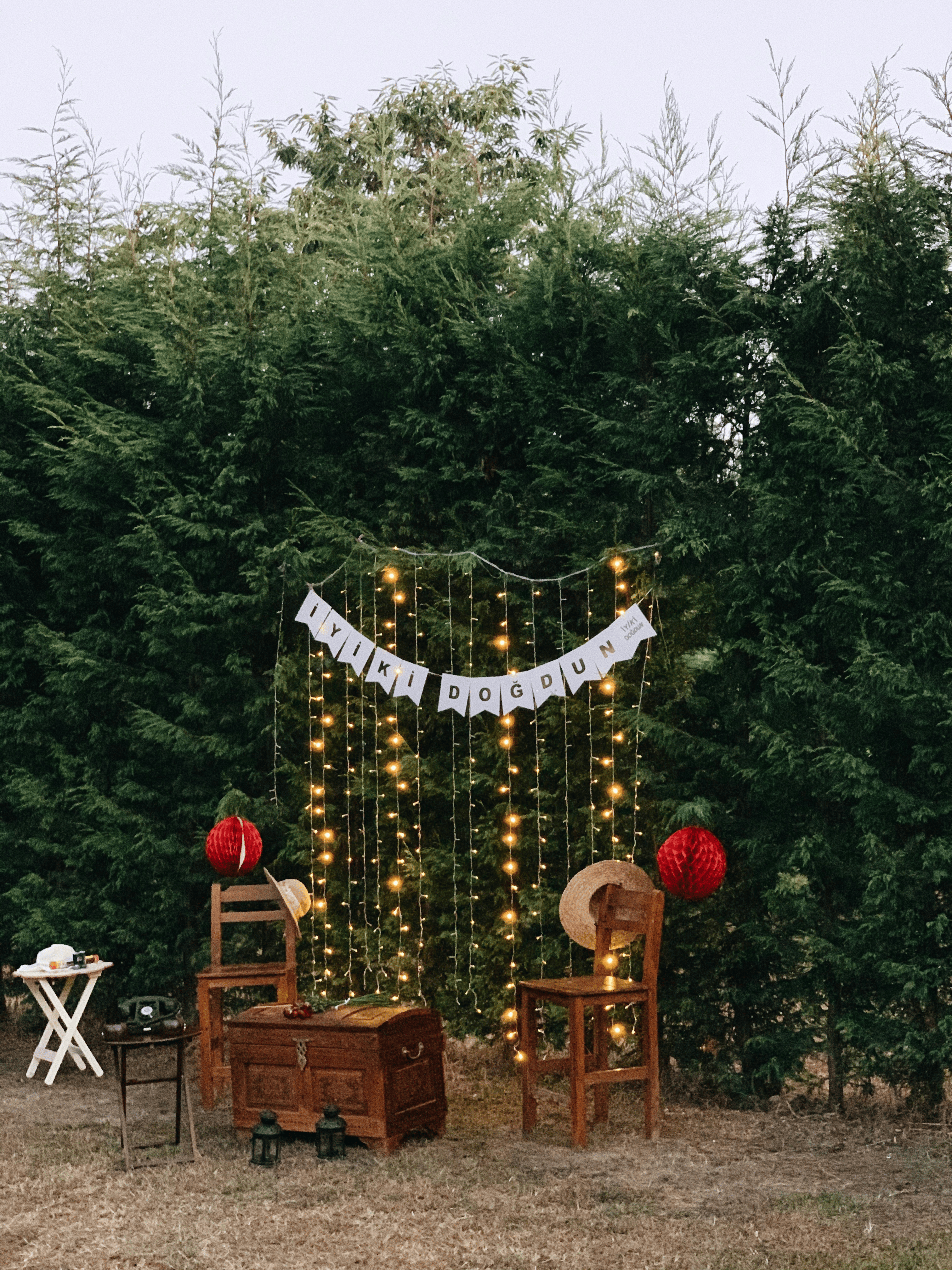 lighting, and cozy lounge areas to create an inviting and magical atmosphere. Soft string lights draped across trees, decorative lanterns